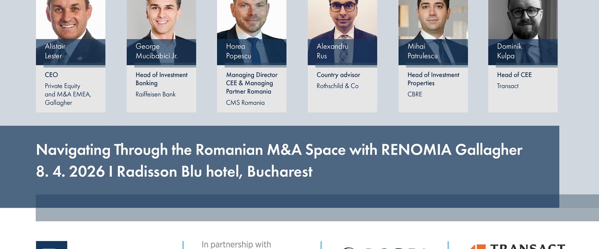 Evenimentul va include un panel moderat de Alistair Lester, CEO, Private Equity and M&A EMEA în cadrul Gallagher. Printre invitați se numără George Mucibabici Jr. (Head of Investment Banking, Raiffeisen Bank România), Horea Popescu (Managing Director CEE & Managing Partner România, CMS România), Alexandru Rus (Country Advisor, Rothschild & Co), Mihai Pătrulescu (Head of Investment Properties, CBRE) și Dominik Kulpa (Head of CEE, Transact). Programul evenimentului este structurat pentru a oferi atât sesiuni interactive, cât și oportunități de networking. Între orele 17:00 și 17:45, invitații se vor putea înregistra. De la 17:45 la 18:00, va avea loc discursul de deschidere, urmat de panelul de discuții „Navigating Through the Romanian M&A Space” (18:00 – 19:30). Seara se va încheia cu un cocktail și cină (19:30 – 22:30), oferind o atmosferă relaxată pentru discuții informale.